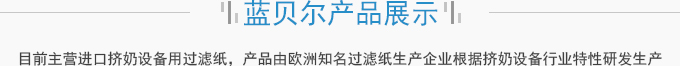 濟(jì)南藍(lán)貝爾工貿(mào)有限公司主要產(chǎn)品擠奶設(shè)備過(guò)濾紙,牛奶過(guò)濾紙,擠奶機(jī)過(guò)濾袋,目前主營(yíng)進(jìn)口擠奶設(shè)備用過(guò)濾紙,產(chǎn)品由歐洲知名過(guò)濾紙生產(chǎn)企業(yè)根據(jù)擠奶設(shè)備行業(yè)特性研發(fā)生產(chǎn),產(chǎn)品符合歐盟食品接觸標(biāo)準(zhǔn)及FDA食品接觸標(biāo)準(zhǔn),產(chǎn)品在擠奶設(shè)備過(guò)濾紙行業(yè)占有70%以上的份額。并通過(guò)了SGS標(biāo)準(zhǔn)技術(shù)檢測(cè)中心按國(guó)標(biāo)食品級(jí)標(biāo)準(zhǔn)進(jìn)行的檢測(cè)。產(chǎn)品適用于各種擠奶設(shè)備品牌,本公司目前獲得該區(qū)域產(chǎn)品營(yíng)銷(xiāo)資格。產(chǎn)品已用于國(guó)內(nèi)各大乳企所屬...